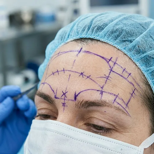 Alın bölgesindeki sarkmaların onarıldığı ve kaşların anatomik pozisyonuna desteklendiği üst yüz cerrahisi.